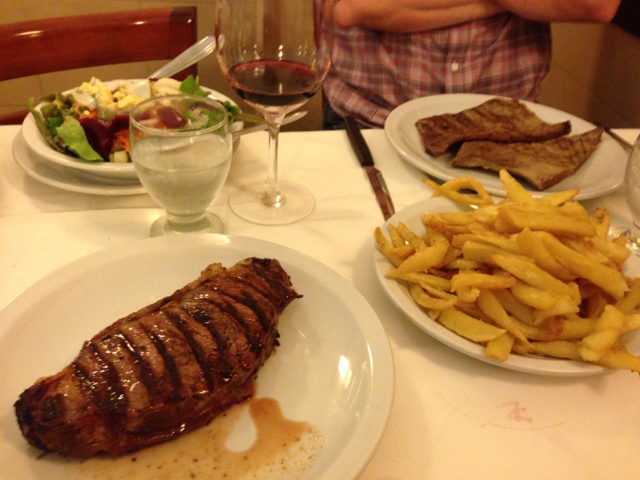 Andrew's first steak was literally a milk-steak. A steak boiled in cream. He said it tasted like a gym shoe (see pic) the waiter immediately brought him a new steak (same cut as mine), however it was well-done, not medium rare (apunto) like mine. Unsatisfied with this, Andrew offered to pay for a third steak, which he got. The waiter only charged for 1, but Andrew tipped generously!!